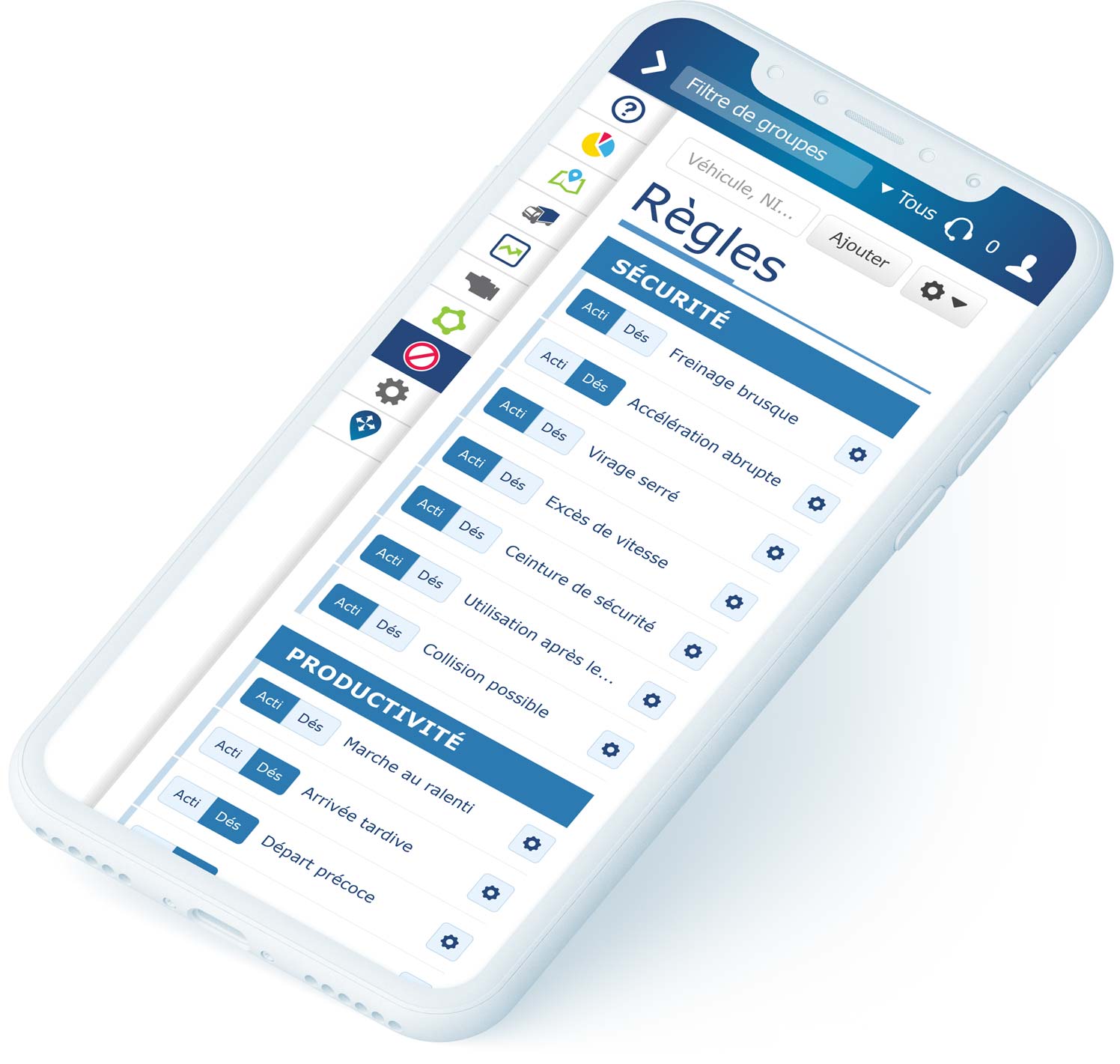 Nous nous engageons à fournir aux entreprises des données de gestion de flotte de grande importance. Les gestionnaires de flotte peuvent commencer rapidement à exploiter ces données en sélectionnant ou en personnalisant les règles qui les aident à mesurer les événements dans cinq domaines essentiels :
